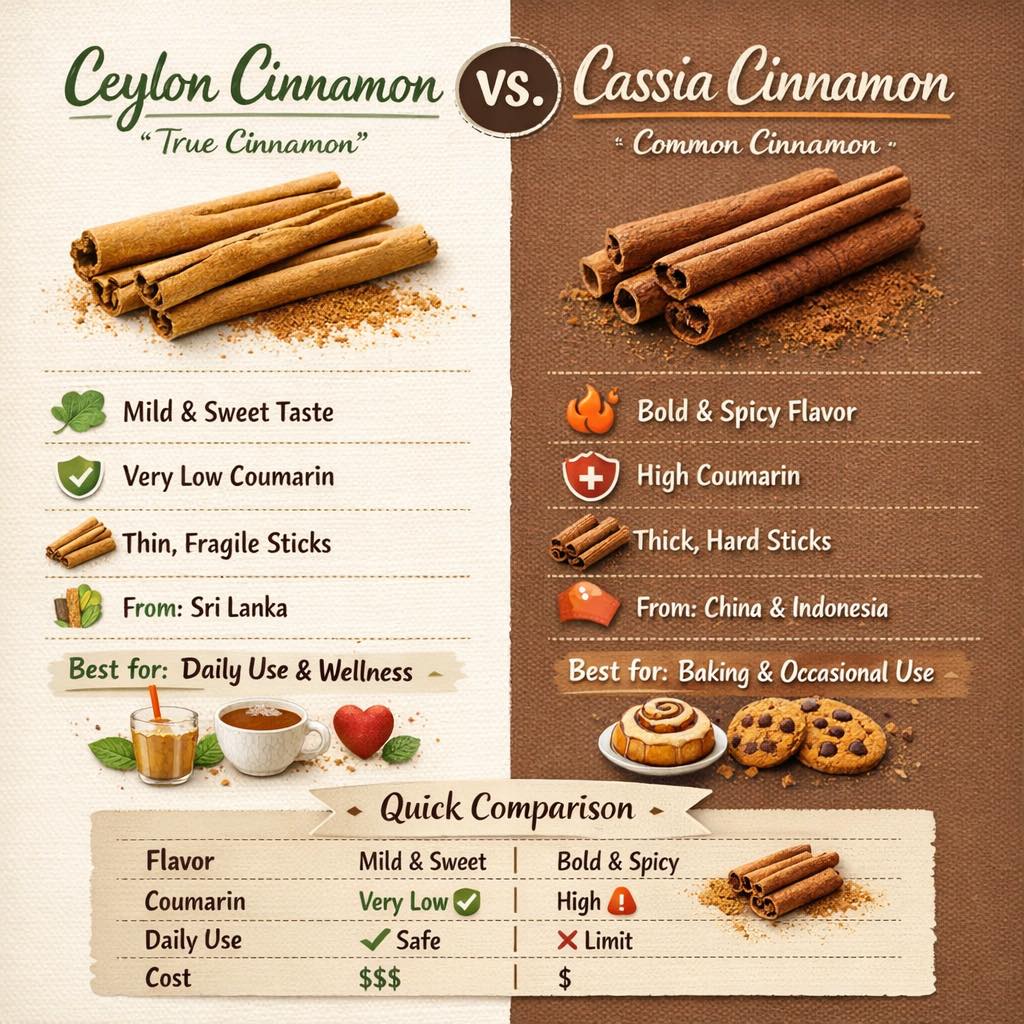 - Coumarin: Very low (true cinnamon standard)